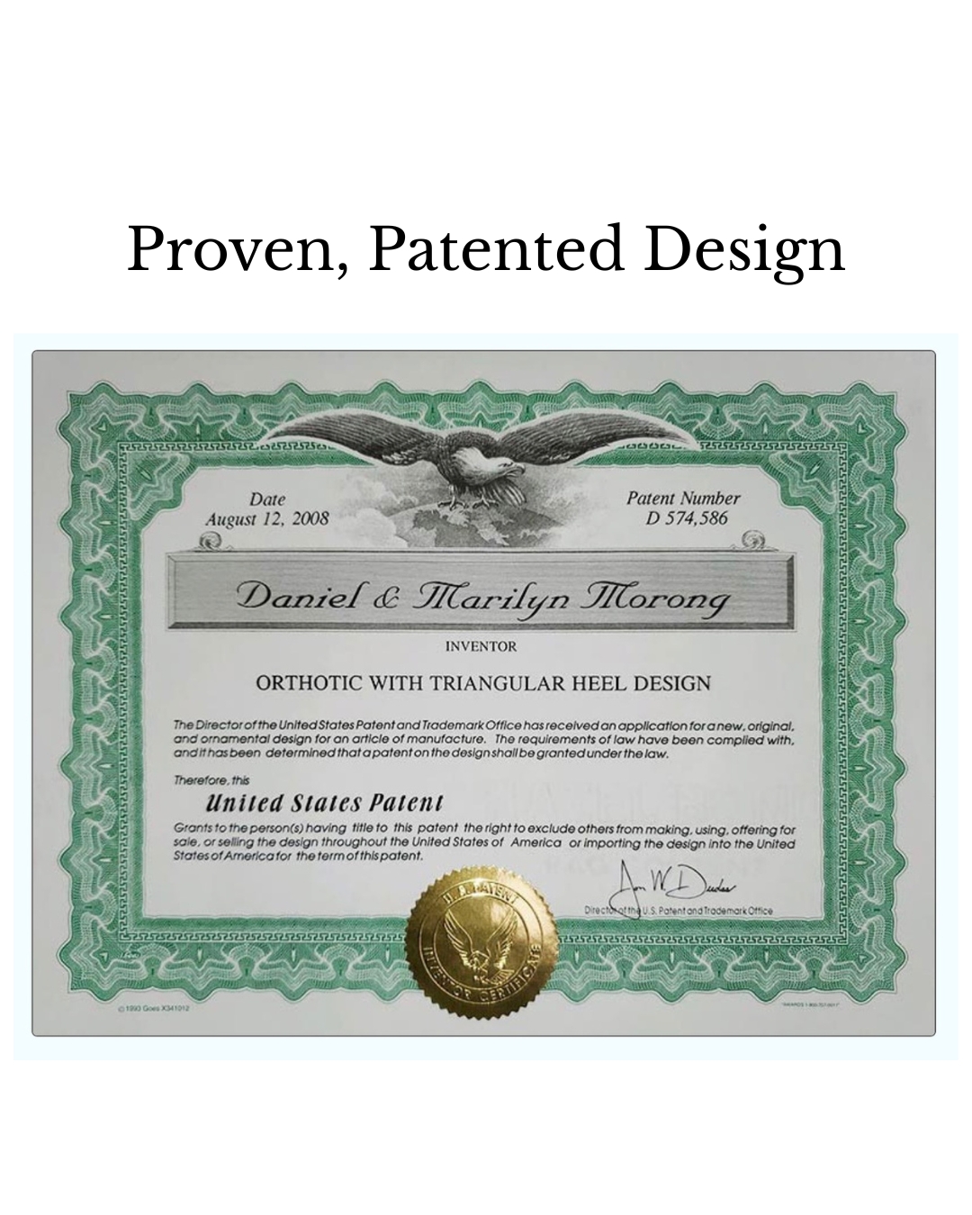 - Our patented orthotics ensure proper arch alignment to alleviate discomfort.